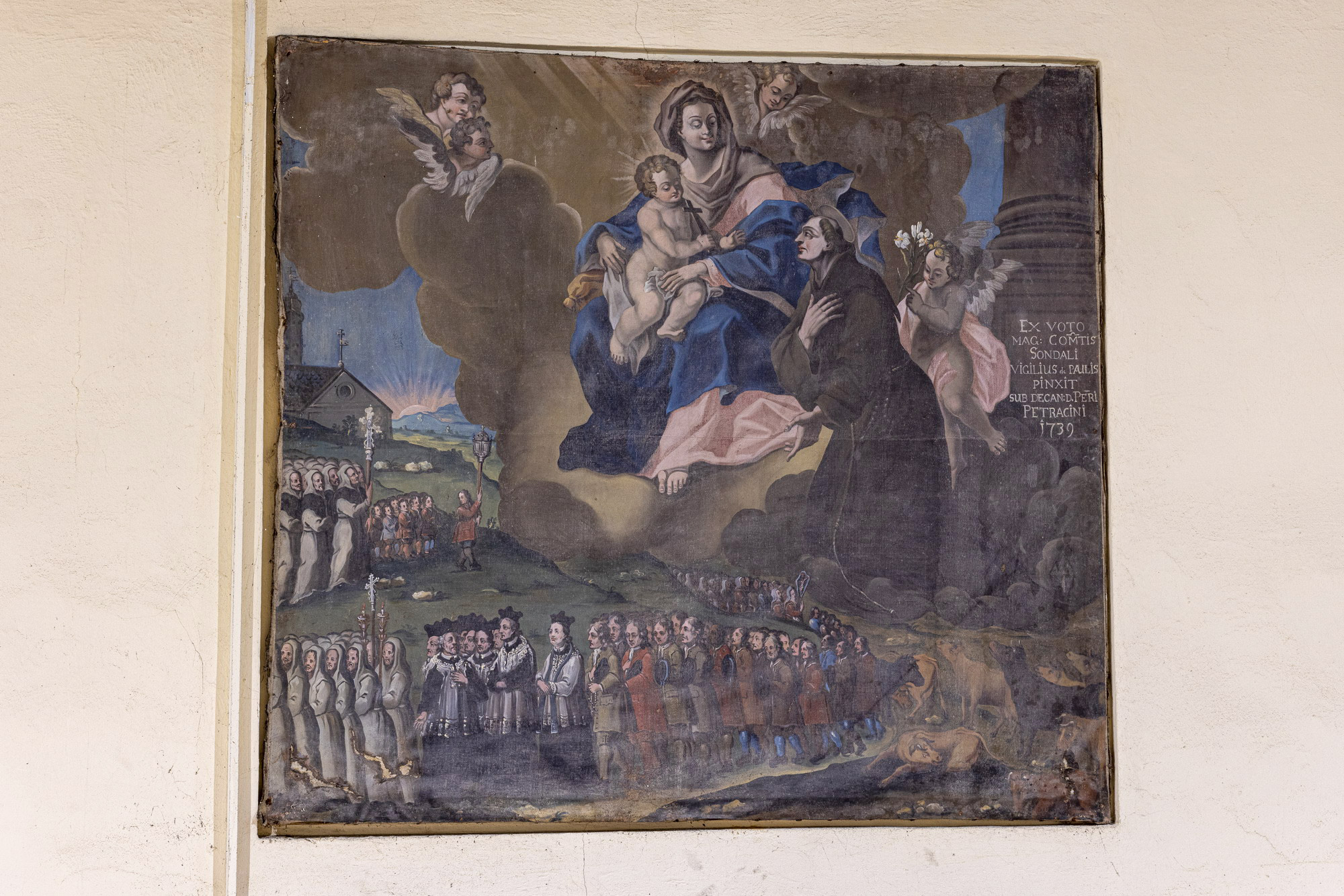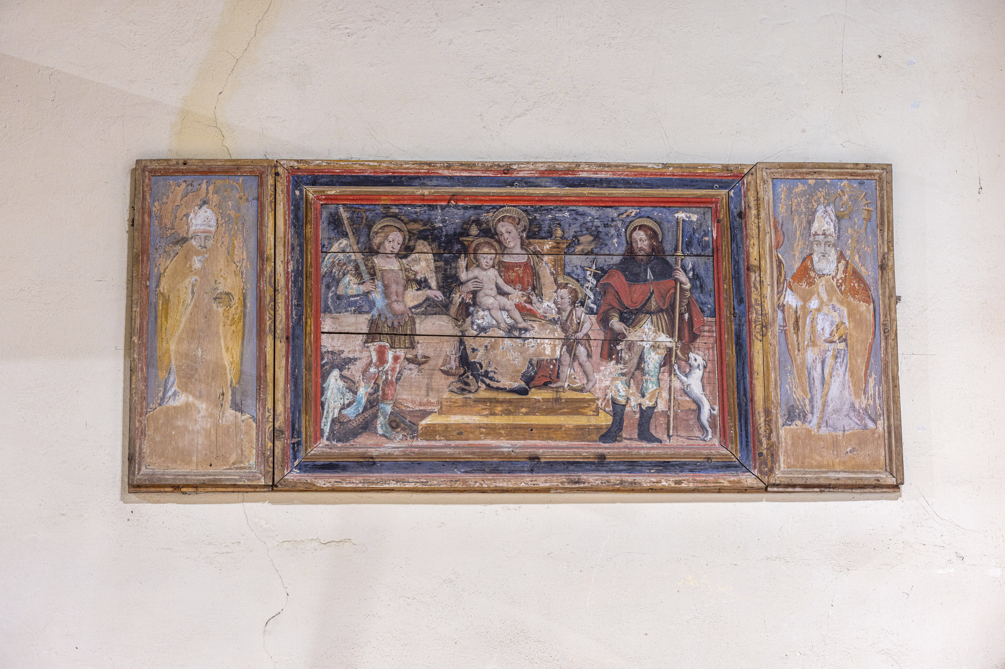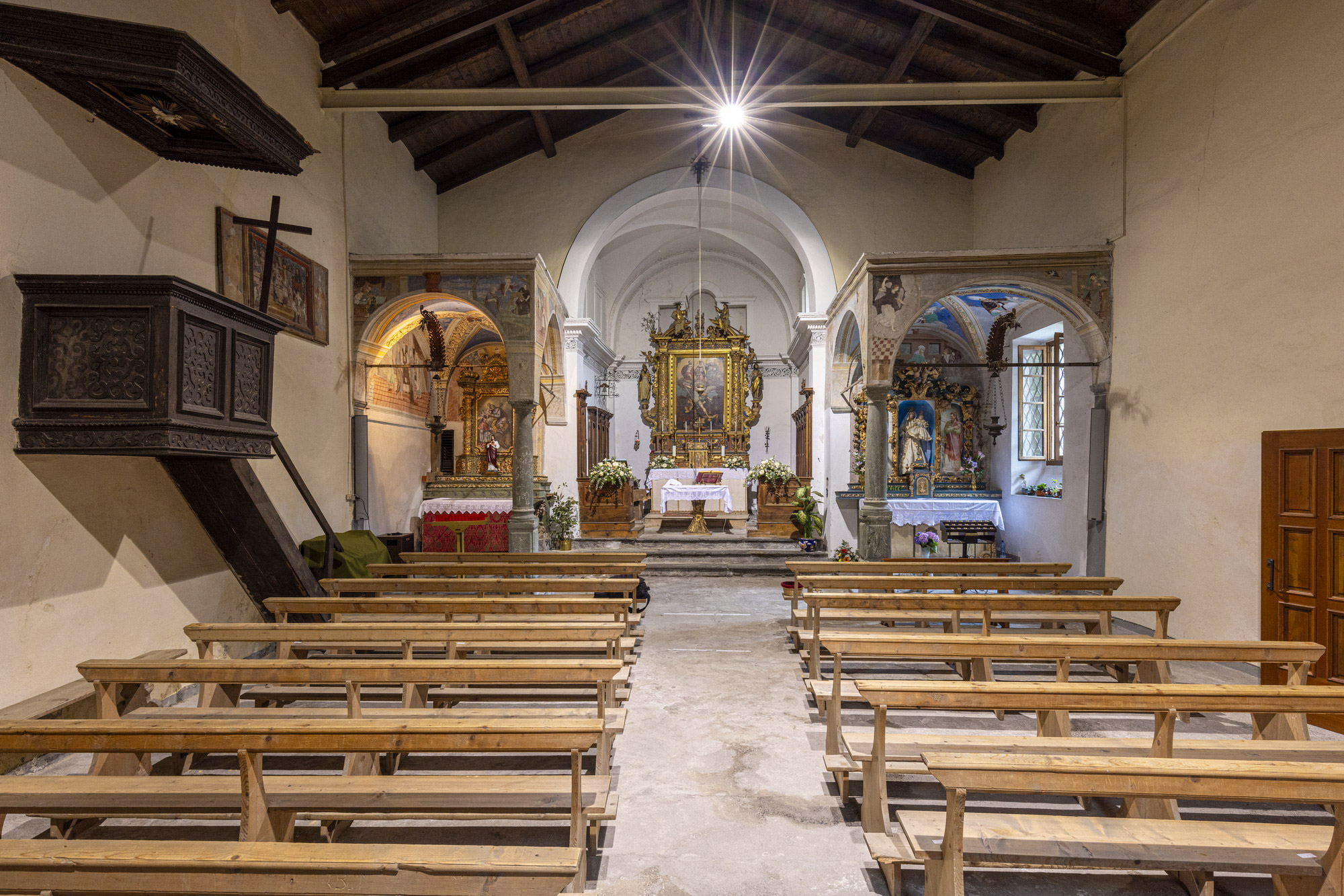 Le due edicole in muratura ai lati dell’arco trionfale sono la cifra distintiva di questa bella chiesa, meta in passato di affollate processioni. Nella cappella della Madonna si venera un goffo manichino mariano che indossa un abito confezionato di recente, segno del perdurare della devozione.